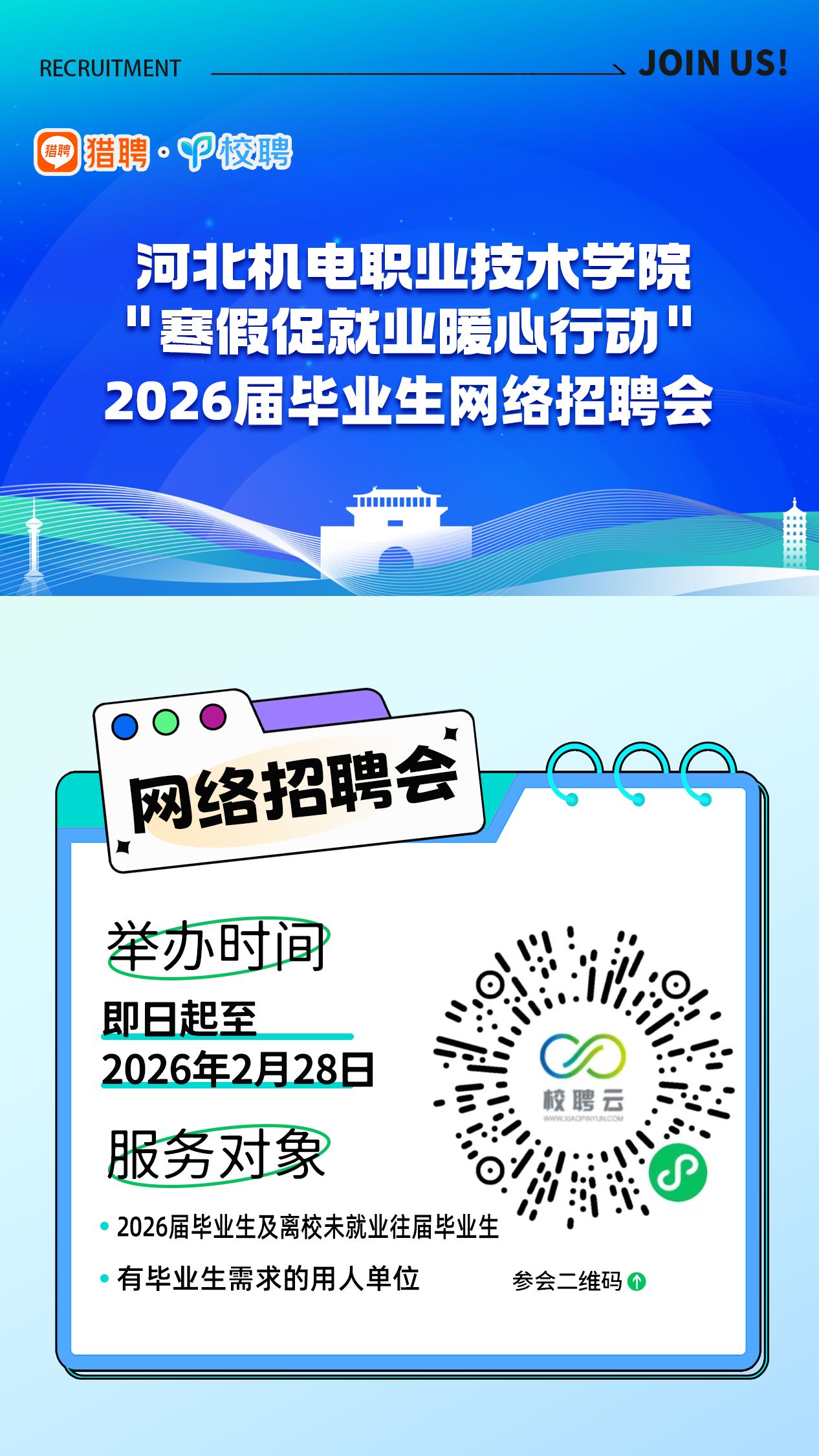 为贯彻落实《关于举办河北省“寒假促就业暖心行动”2026届高校毕业生网络招聘会的通知》(冀教就创中心〔2026〕1号)文件精神,充分把握利用寒假关键期,着力拓展优质就业岗位,优化就业服务体验,切实提升就业工作实效。我校联合猎聘·校聘举办“寒假促就业暖心行动”2026届毕业生网络招聘会。现将有关事项通知如下:
